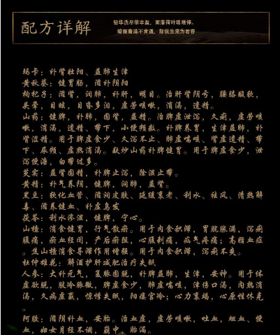 蜂蜜、黃秋葵、枸杞子、山藥、芡實(shí)、黃精、黑豆、茯苓、山楂、瑪咖粉、杜仲雄花、人參(人工種植)、阿膠、純化水。