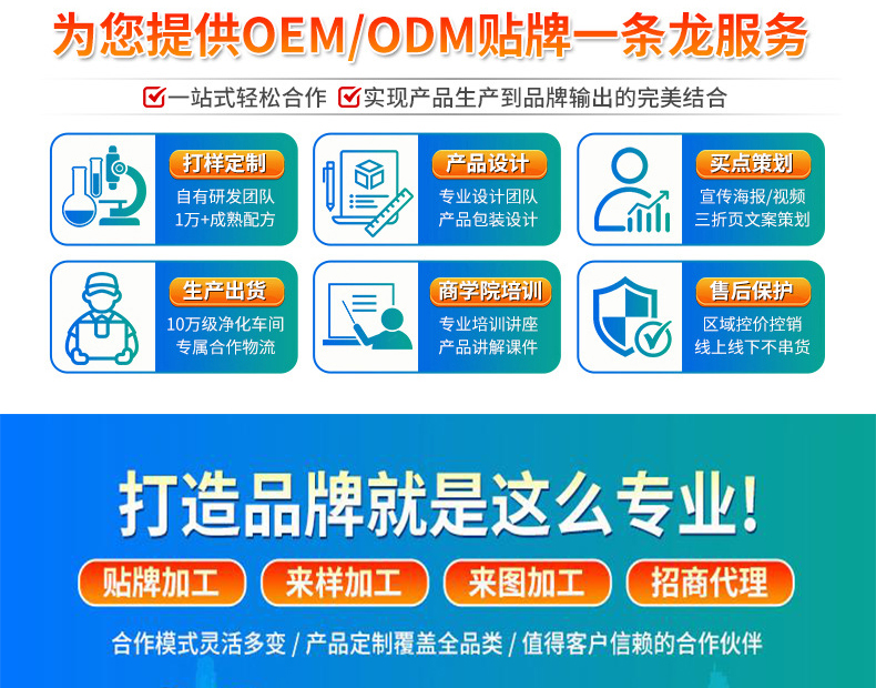 璟鵬生物為您提供完整的OEM貼牌加工服務(wù),產(chǎn)品策劃(劑型、配方、工藝制定)、商標(biāo)注冊(cè)、包裝設(shè)計(jì)、產(chǎn)品注冊(cè)備案審批、下單生產(chǎn)、檢驗(yàn)出廠、全程無(wú)憂(yōu)一件代發(fā)。
