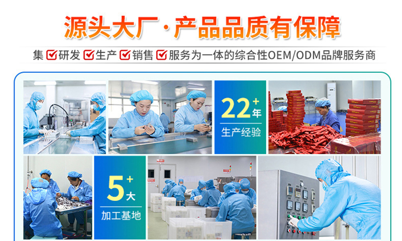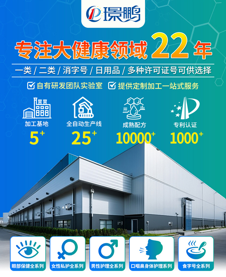 璟鵬生物為您提供完整的OEM貼牌加工服務(wù),產(chǎn)品策劃(劑型、配方、工藝制定)、商標(biāo)注冊、包裝設(shè)計、產(chǎn)品注冊備案審批、下單生產(chǎn)、檢驗(yàn)出廠、全程無憂一件代發(fā)。